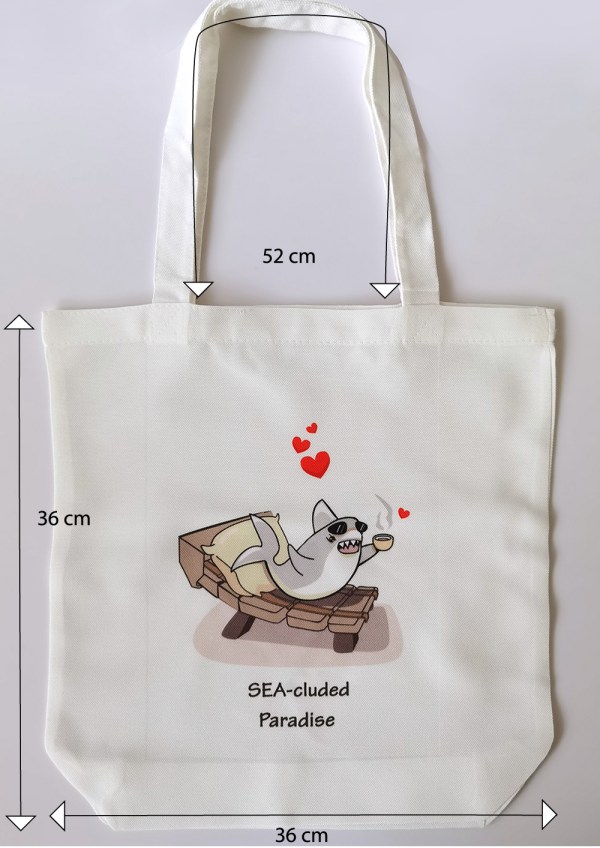 Secluded Paradise Tote Bag – A shark who is enjoying its alone time on the proverbial tropical island. On a beach where there’s no actual sea and the sea is actually all around it! Even in an extra-ordinary situation or a situation which is simply the way it is, we are present in our own company! That never changes!